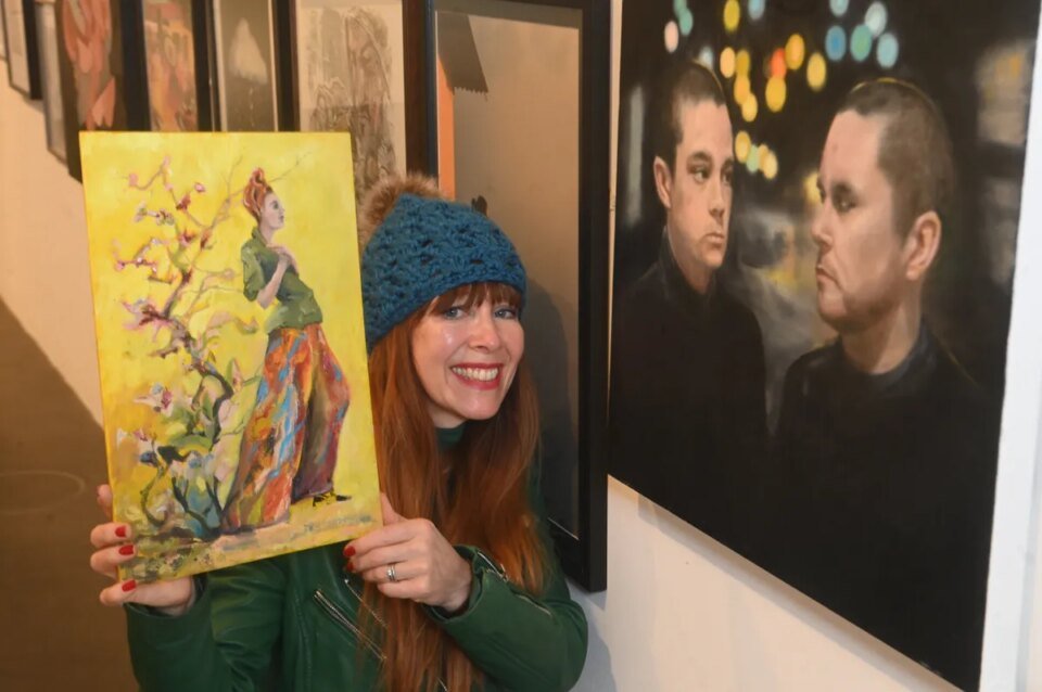 Elizabeth Whitehouse with her paintings at the Walsall Society of Artists 75th annual exhibition at The New Walsall Art Gallery.