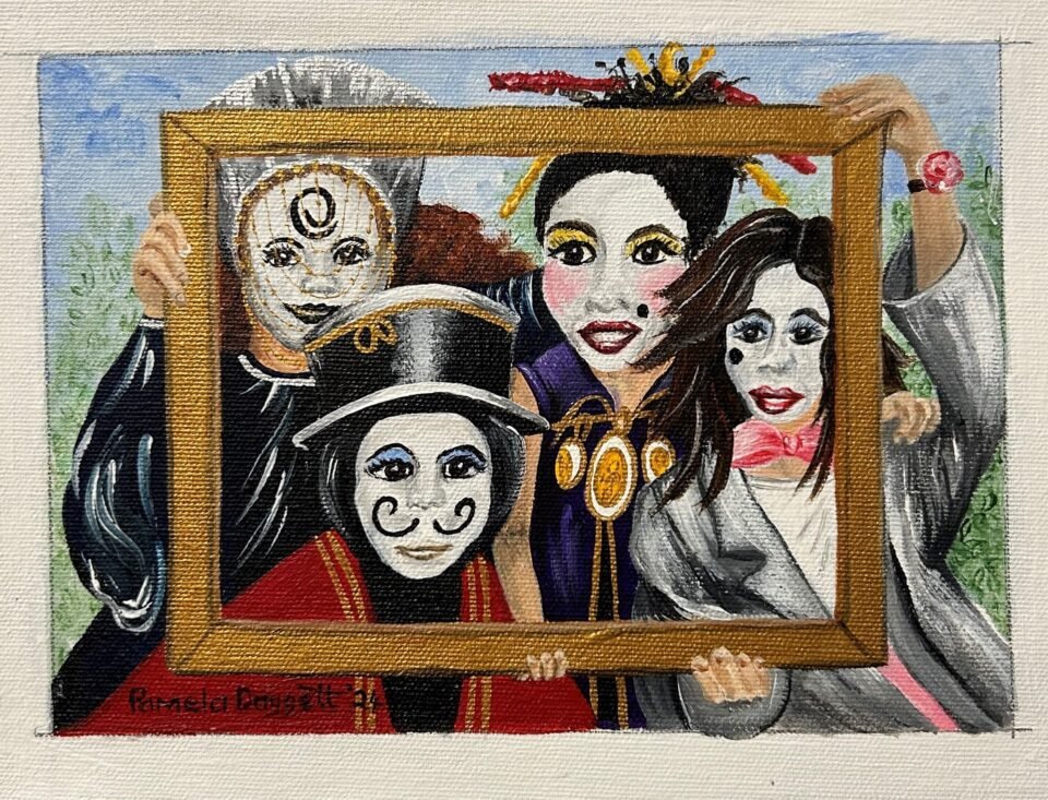 “My painting is of one such event. These crazy people were mingling among the guests, no spoken word, all mime.”