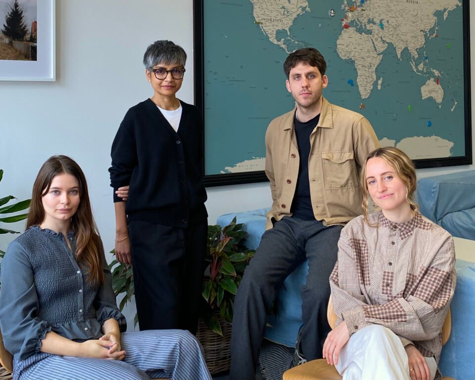 A group portrait of four people seated and standing in an office environment in front of a large world map. Two women sit in front, while a woman and a man stand behind them. A framed photograph and houseplants are visible in the background.