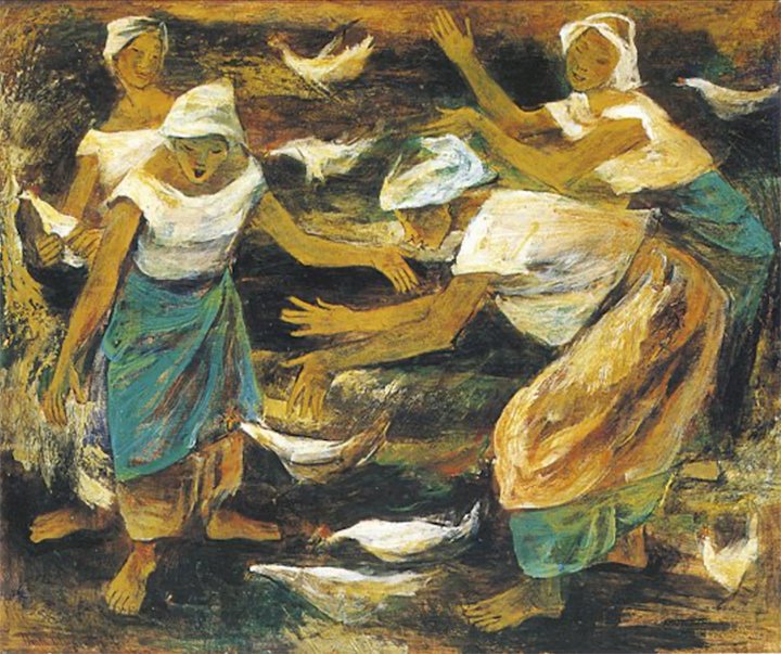Modernist pioneer Anita Magsaysay-Ho’s Chickens is part of a 1960s series depicting women harvesting fruits and grains, and vending fish in the market. The artwork emphasized movement in busy interactions through bold and dynamic brushstrokes, strong contrast of shadow and light.