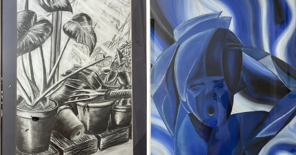 One is a pencil drawing of a rubber plant and garden implements and the other is a more abstract painting of a blue face and figure against a flame type background.