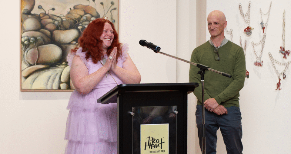 2025 pro hart outback art prize winner krystle evans with guest judge brett adlington
