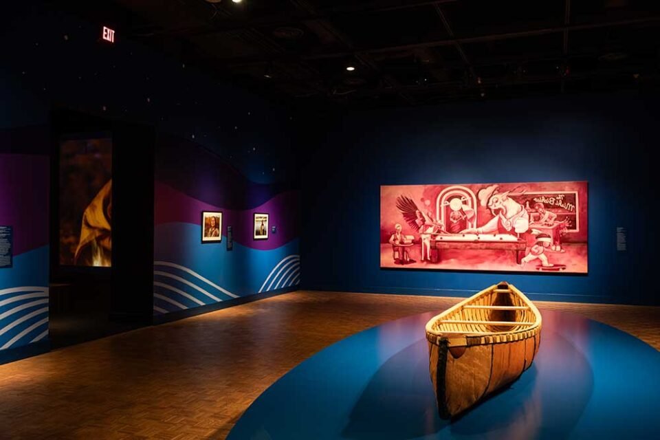The Contemporary Anishinaabe Art exhibit displays vibrant culture, painstaking artistry, and layers of Indigenous identity. You won’t find ceremonial regalia here. Instead there’s photography, paintings, basketweaving, sculptures, clothing, and film by modern Anishinaabe artists. The Anishinaabe are the original people of the Great Lakes region and include the Ojibwe, Odawa, and Potawatomi peoples, who still inhabit this land.