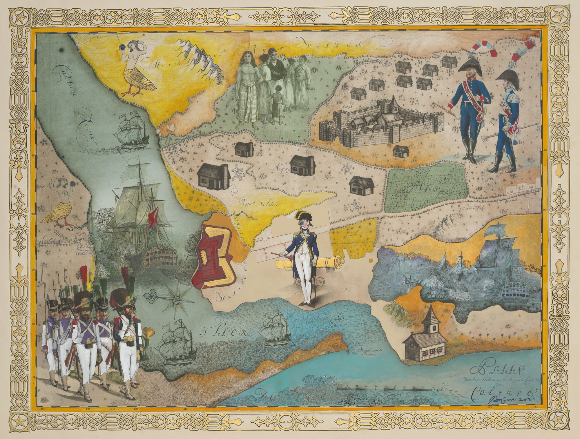 Following an introduction that centres Indigenous knowledge and diverse artistic languages, the exhibition’s first section, Re-Visioning History, will include Pala Pothupitiye’s Kalutara Fort (2020–21), a reimagined map of Sri Lanka’s historic military camp, initially built by Portuguese occupiers, later captured by Dutch settlers and ultimately surrendered to British colonial powers. This section will also feature artists Brenda Fajardo, Elisabet Kauage, Mathias Kauage, and John Siune, whose work There is still a war going on in Bougainville (1995) responds to Papua New Guinea’s Bougainville conflict (1988–98), the largest and most deadly conflict in Oceania since the end of the Second World War. Photography will also play a prominent role in this section, with works by Naomi Hobson and Michael Cook capturing intimate portraits and stylised scenes of life, both real and imagined.