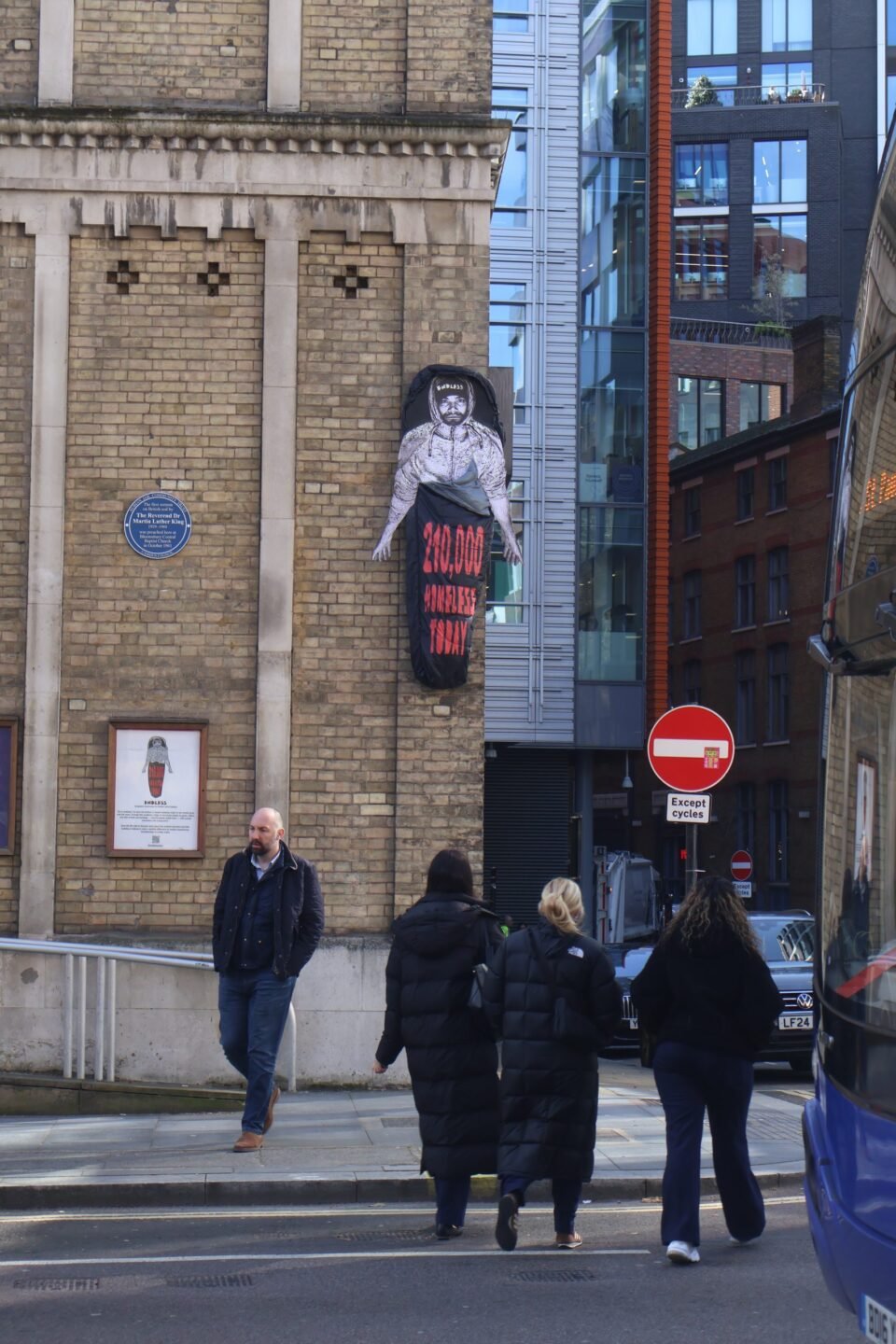 On the corner wall of Bloomsbury Central Baptist Church in London, just a stone’s throw from Oxford Street, one of the busiest shopping areas in Europe, a figure by British street artist Endless has been installed. The figure is of a rough sleeper, an individual experiencing homelessness, tucked into a sleeping bag with the text “210,000 Homeless today.” Installed within the context of one of the wealthiest areas of the city, the work confronts the harsh realities lived by thousands every day and cogently juxtaposes it with the city’s affluence.