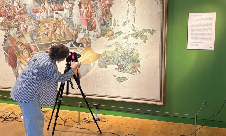 Christ Preaching at Cookham Regatta, which occupied Spencer for more than a decade but remained incomplete at the time of his death in 1959, has been hung high up in the gallery since it opened in 1962. Now, the centrepiece of Revealing Genius, Conserving Art: Stanley Spencer’s Final Masterpiece, has been brought down to ground level, allowing conservation student Olivia Leake to investigate Spencer’s methods and materials.