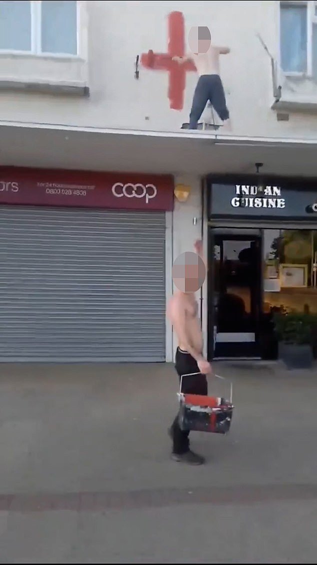 Footage widely circulated on social media shows two topless men painting red crosses on the white walls of flats above a row of shops and restaurants on a high street in Basildon, Essex.