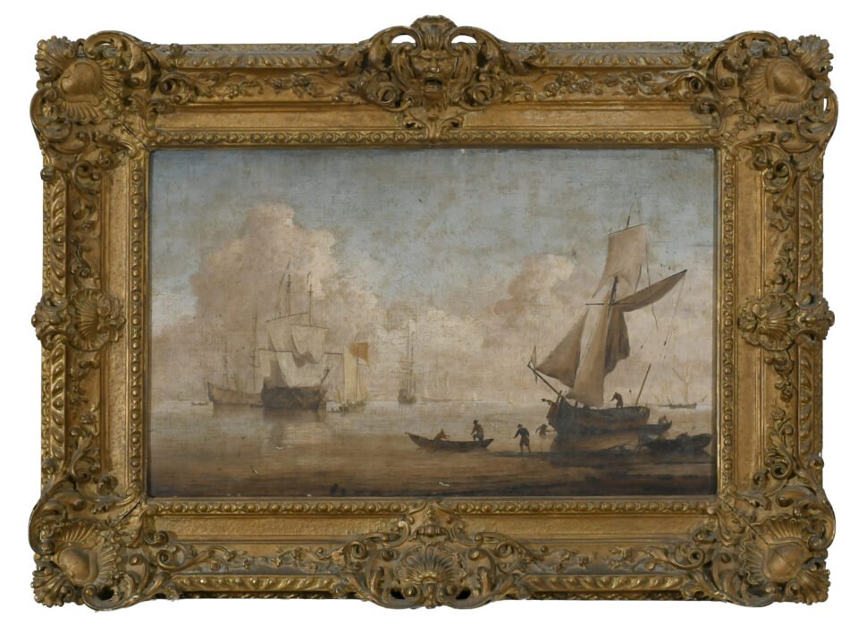 Dating from around 1680 and painted in England, the work’s existence was suspected when English art historian Michael Robinson identified a smaller work by Van de Velde depicting a small sailing ship in a Dutch private collection which he thought could have formed part of a larger canvas. The sailing ship, or galliot, shows a marked similarity to the one depicted in the newly discovered painting.