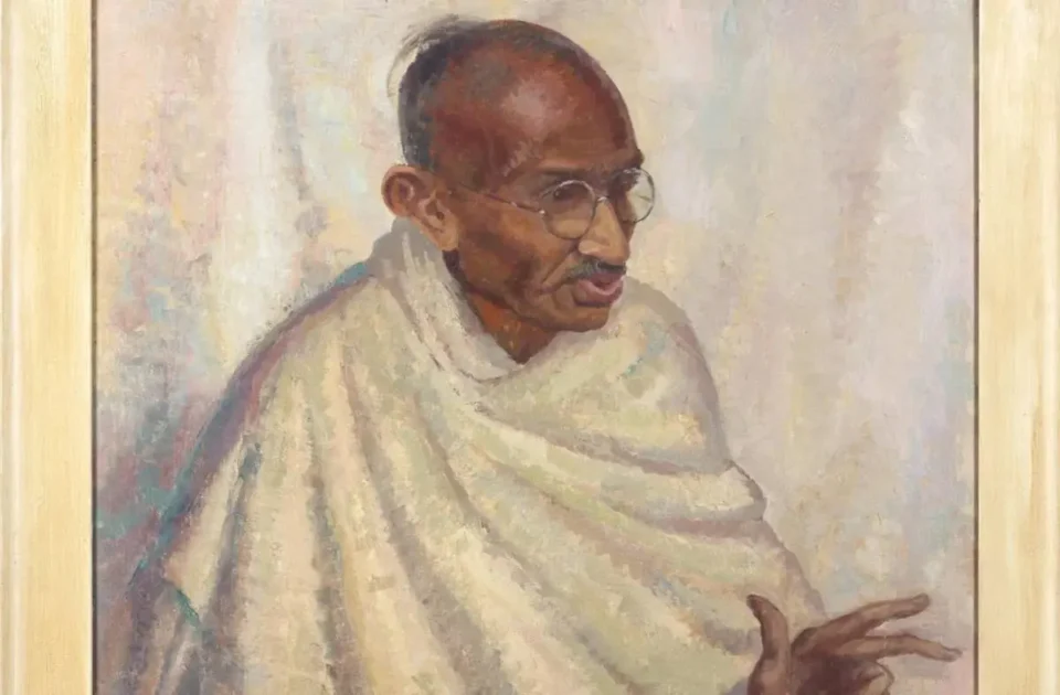 The artwork also carries a grim reminder of Gandhi’s violent death. Gandhi was assassinated in 1948 by Nathuram Godse, a Hindu nationalist. According to the Leighton family, the painting itself was later attacked with a knife by a “Hindu extremist,” believed to be an activist from the RSS organization, in the early 1970s.