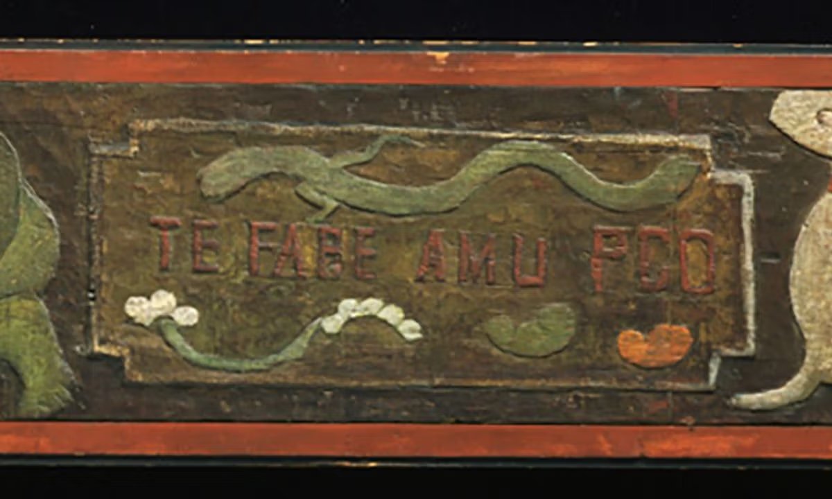 Carved in a rough style on sequoia wood, and nearly 1.5m wide, the text “TE FARE AMU” is followed by “PGO”, an abbreviation for Paul Gauguin. The artist enjoyed the fact that in French these letters would be pronounced “pego”, a slang word for penis.