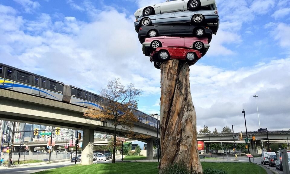 Marcus Bowcott and Helene Aspinall’s Trans Am Rapture (2015)—a 33-ft-tall sculpture originally titled Trans Am Totem that consists of five salvaged cars stacked atop the trunk of an old-growth cedar tree—was initially installed temporarily as part of the 2014-16 Vancouver Biennale. In 2019, Chip Wilson, the local philanthropist and founder of the Lululemon athletic apparel company, donated C$250,000 ($201,000) to save the sculpture and make it part of the city’s permanent public art collection.
