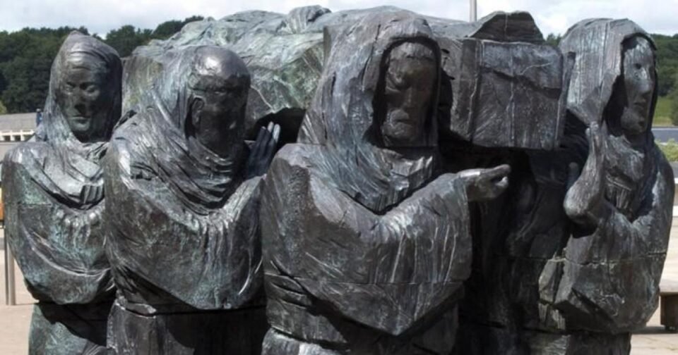Sculpture of monks carrying St Cuthbert’s coffin in Durham